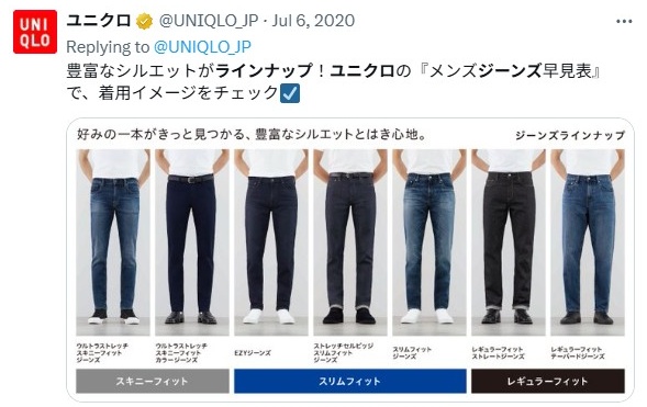ユニクロは、ジーンズのシルエット、カラー、加工のバリエーションが非常に豊富です。