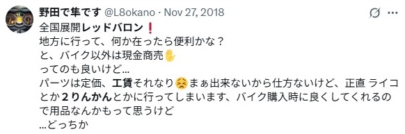 料金だけを比較すると、レッドバロンは専門業者や用品店に比べて高めの価格帯になることが多く、「高い」という評価は実態を伴っていると言えます。