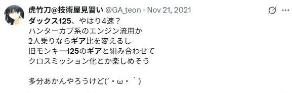 現行のダックス125には、スーパーカブ110などにも採用されている遠心クラッチ式の4速トランスミッションが搭載されています。