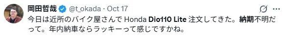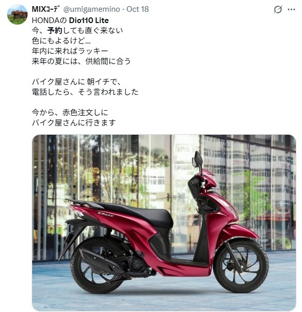 2026年に入り、ホンダの生産体制は安定しつつありますが、Dio110 Liteは価格の安さから需要が常に高く、入荷してもすぐに売れてしまうという回転の速さが納期に影響を与えています。