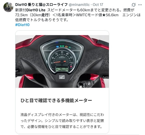 - 2025年11月2日ホンダ車Dio110 Liteの最高速が遅すぎるが燃費は鬼ヤバ!