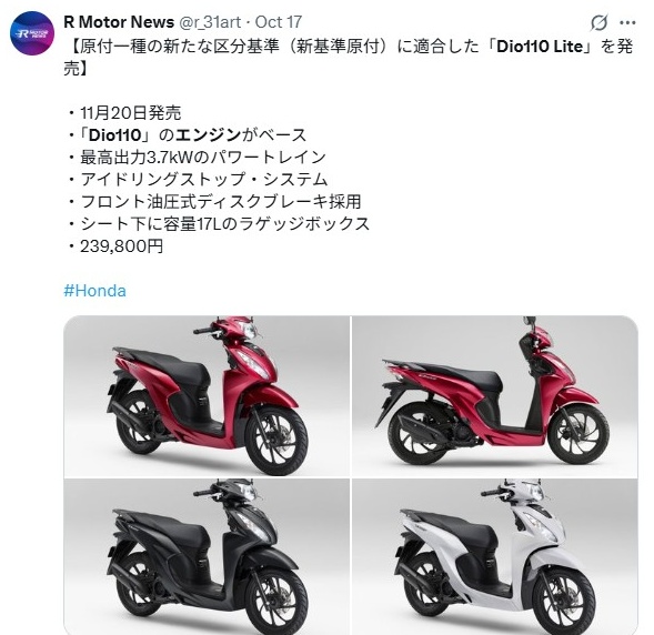 ホンダのDio110 Lite(ディオ110 ライト)は、日本の原付二種市場において、その軽量さと驚異的な経済性で注目を集めているモデルです。