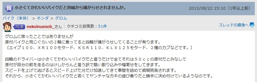 グロムに限ったことではありませんが原付バイクと同じぐらいの2輪に乗ってると四輪が嫌がらせしてくることが有ります。〔エイプ100、XR100モタード、KSR110、KLX125モタード、2種のカブなどです。〕四輪のドライバーは小さくてかわいいバイクだと言うだけで全てそれは50ccの原付だとみなして原付が自分の前を走るのはけしからんと言う訳で酷い割り込みや幅寄せをしてきます。