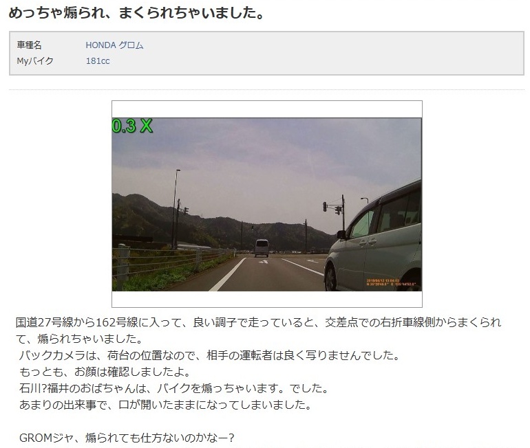 国道27号線から162号線に入って、良い調子で走っていると、交差点での右折車線側からまくられて、煽られちゃいました。バックカメラは、荷台の位置なので、相手の運転者は良く写りませんでした。もっとも、お顔は確認しましたよ。石川?福井のおばちゃんは、バイクを煽っちゃいます。でした。あまりの出来事で、口が開いたままになってしまいました。GROMジャ、煽られても仕方ないのかなー?