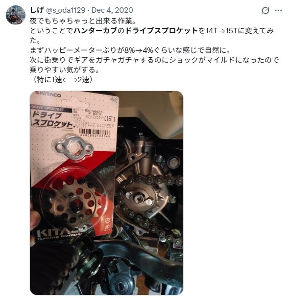 ハンターカブの純正フロントスプロケットは14丁というサイズで、これは荷物を積んで坂道を登ることを想定した、加速重視の設定です。