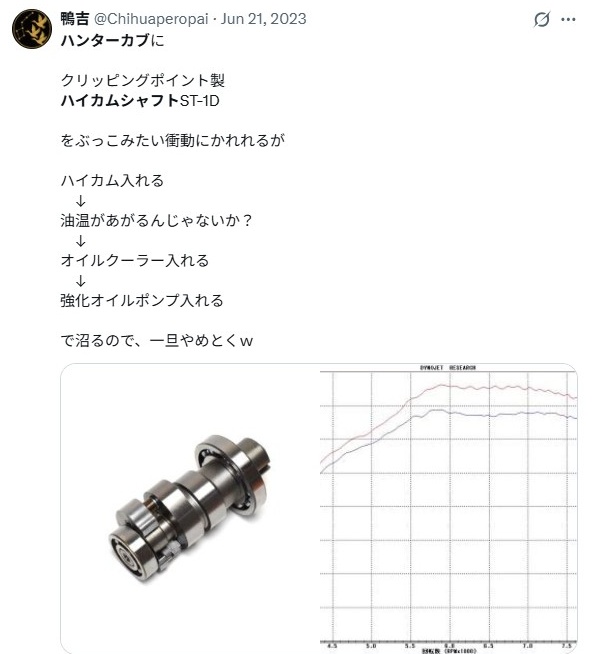 ハイカムを入れると、低回転のトルクは若干細くなる場合がありますが、その代わり中回転から高回転にかけてのパワーの盛り上がりが別物になります。