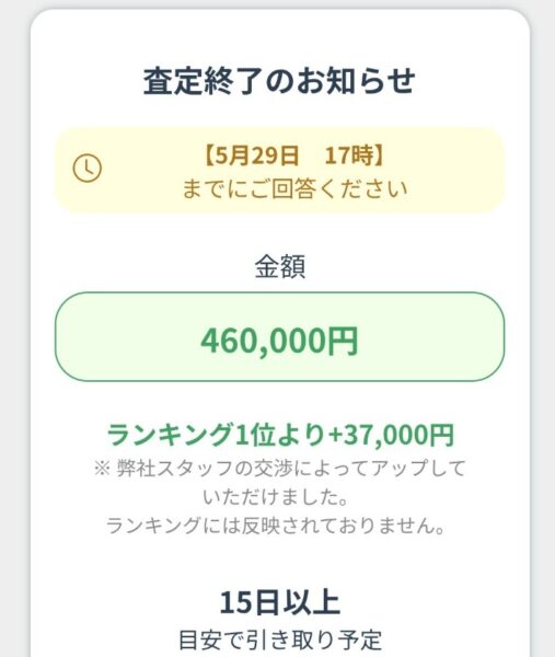 もし希望に届かなければ無理に売る必要はありませんが、全国の業者が競った結果の金額は、その時点での紛れもない市場の最高評価です。