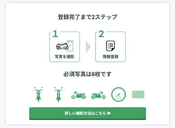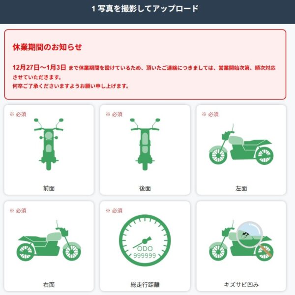 専用の撮影ガイドが表示されるので、それに従ってバイクをパシャパシャと撮っていきます。