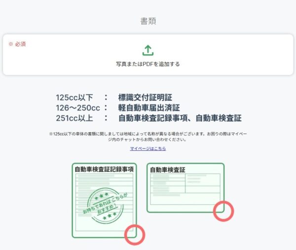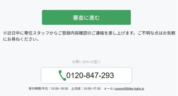 写真のアップロード、必要書類のアップロード、バイク情報の入力が完了したら、最後に「審査に進む」をクリック。