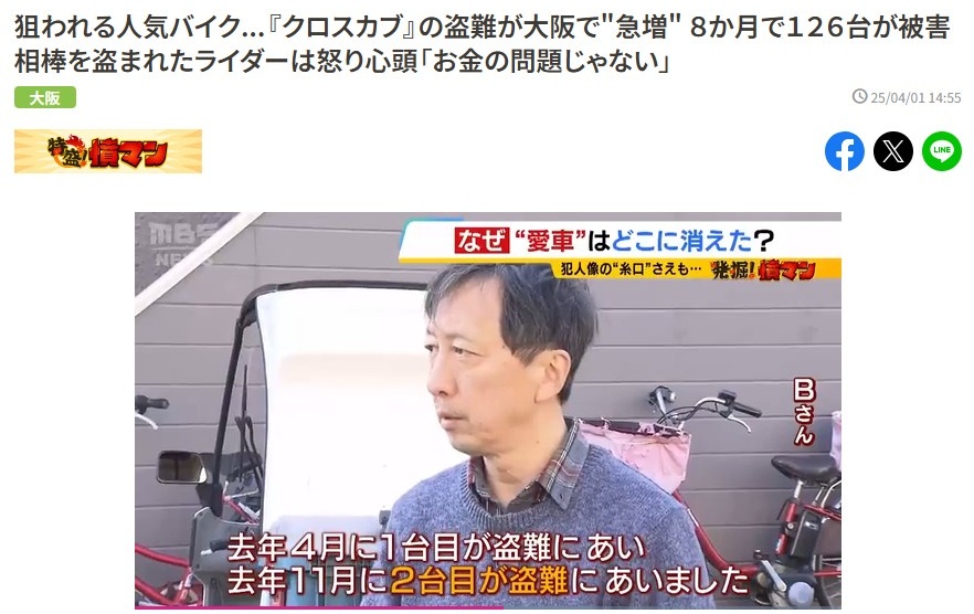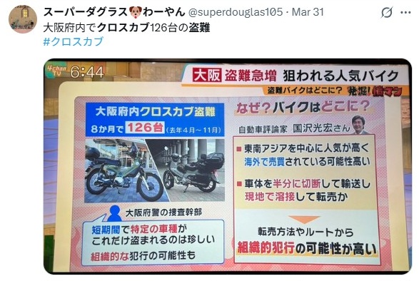 まず、大阪府内だけで短期間に160台を超えるクロスカブが組織的に狙われているという事実に、強い憤りを覚えます。