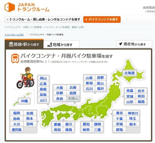 全国のレンタルバイクコンテナを簡単にリサーチできるJAPANトランクルームはこちら!