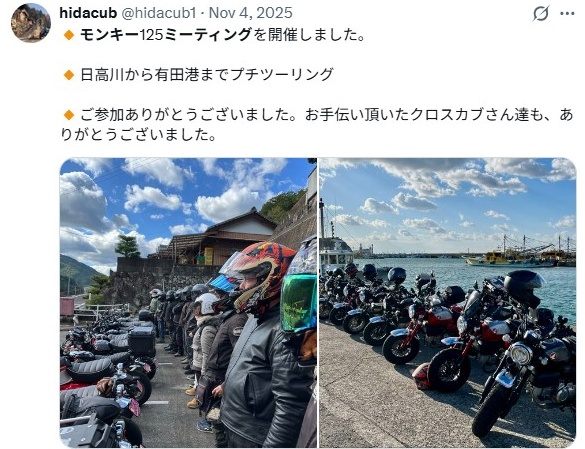 モンキー125は非常にファンが多いモデルなので、全国各地でオーナーズミーティングが開催されています。また、SNS上でも活発なコミュニティが存在します。