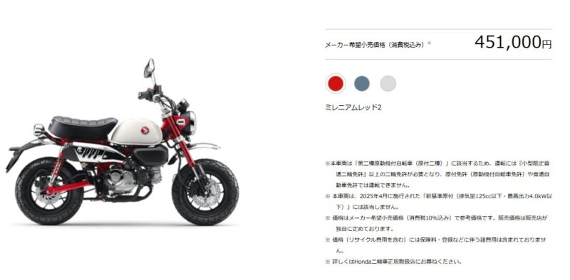 モンキー125のメーカー希望小売価格は、現行モデルで