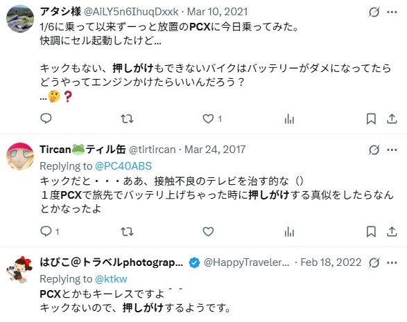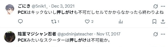 「PCXは、ほとんどのモデルで押しがけができない・・」
