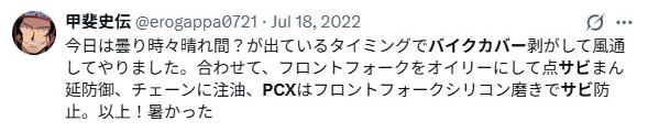雨を防ぐためにカバーを掛けますが、実はカバー内部の湿気もPCXの大敵です!