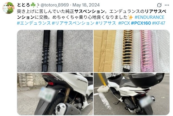 PCX160のノーマルサスペンションは、街乗りでの乗り心地を優先したセッティングのため、高速走行時や積載量が増えた際に、車体が大きく沈み込み、路面のギャップに対する収束が悪くなります。