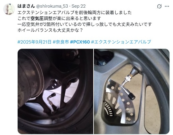 取扱説明書に記載されている二人乗り・高負荷時の指定空気圧に合わせて調整するか、若干高めに設定することで、安定性と燃費の向上、パンクのリスク軽減につながります。