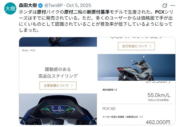 また、PCXの価格帯は原付一種としてはあまりに高額すぎます。装備を簡略化して安くしようとすれば、それはもはやPCXではなくなってしまいます。