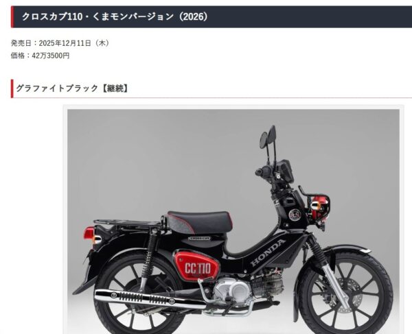そこで、2025年の12月11日にホンダがクロスカブ110の新型として「くまモンバージョン」をリリースしています。