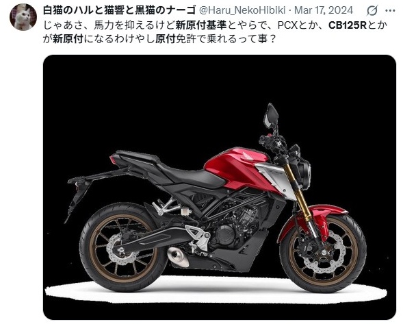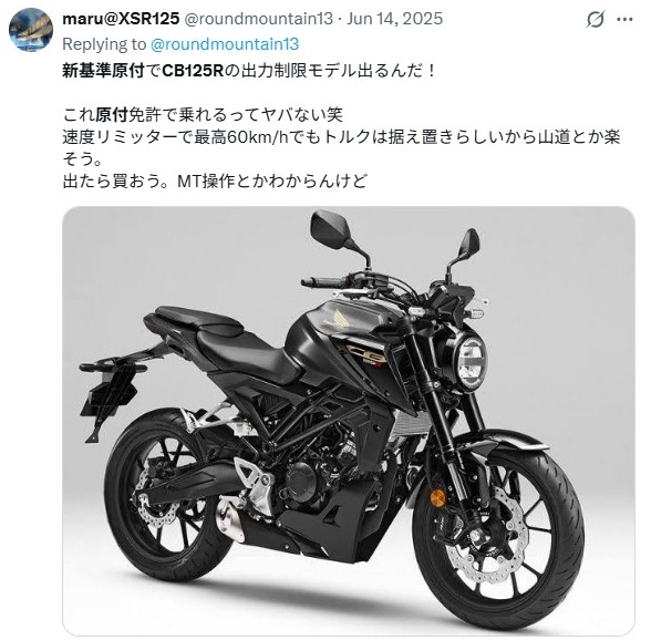 もしホンダがCB125Rをベースにした新基準原付モデルを発売した場合、そのモデルであれば原付免許で運転可能です。