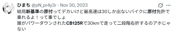 しかし、現在流通しているほとんどのCB125Rは、排気量に関係なく最高出力が11kWあります。これを原付免許で運転することは絶対にできません。