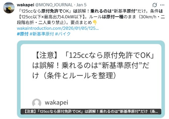 新基準原付制度が始まったことで、同じ125ccという数字が二つの異なる免許区分に存在することになりました。