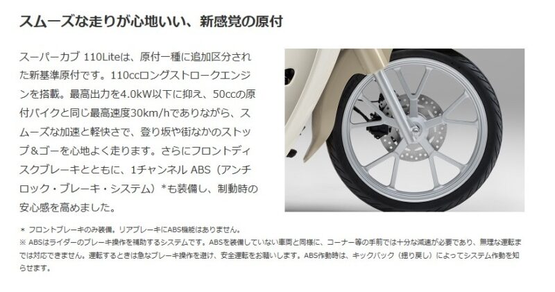 スーパーカブ110 Liteは、新基準原付として、109ccのエンジンを搭載しながらも最高出力を3.5kW(4.8PS)に制御され、法定速度30km/hという原付一種の交通ルールを遵守する車両です。