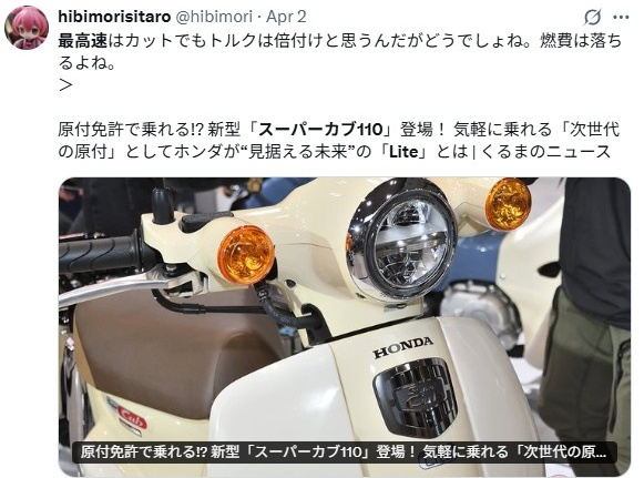スーパーカブは元々、高速度での走行を主眼に置いた設計ではありません。