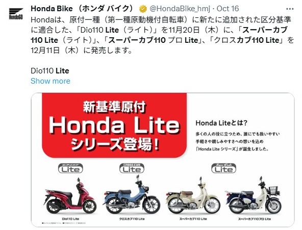 「スーパーカブ110 Lite」は、2025年11月に導入される**「新基準原付」**に適合したモデルです。